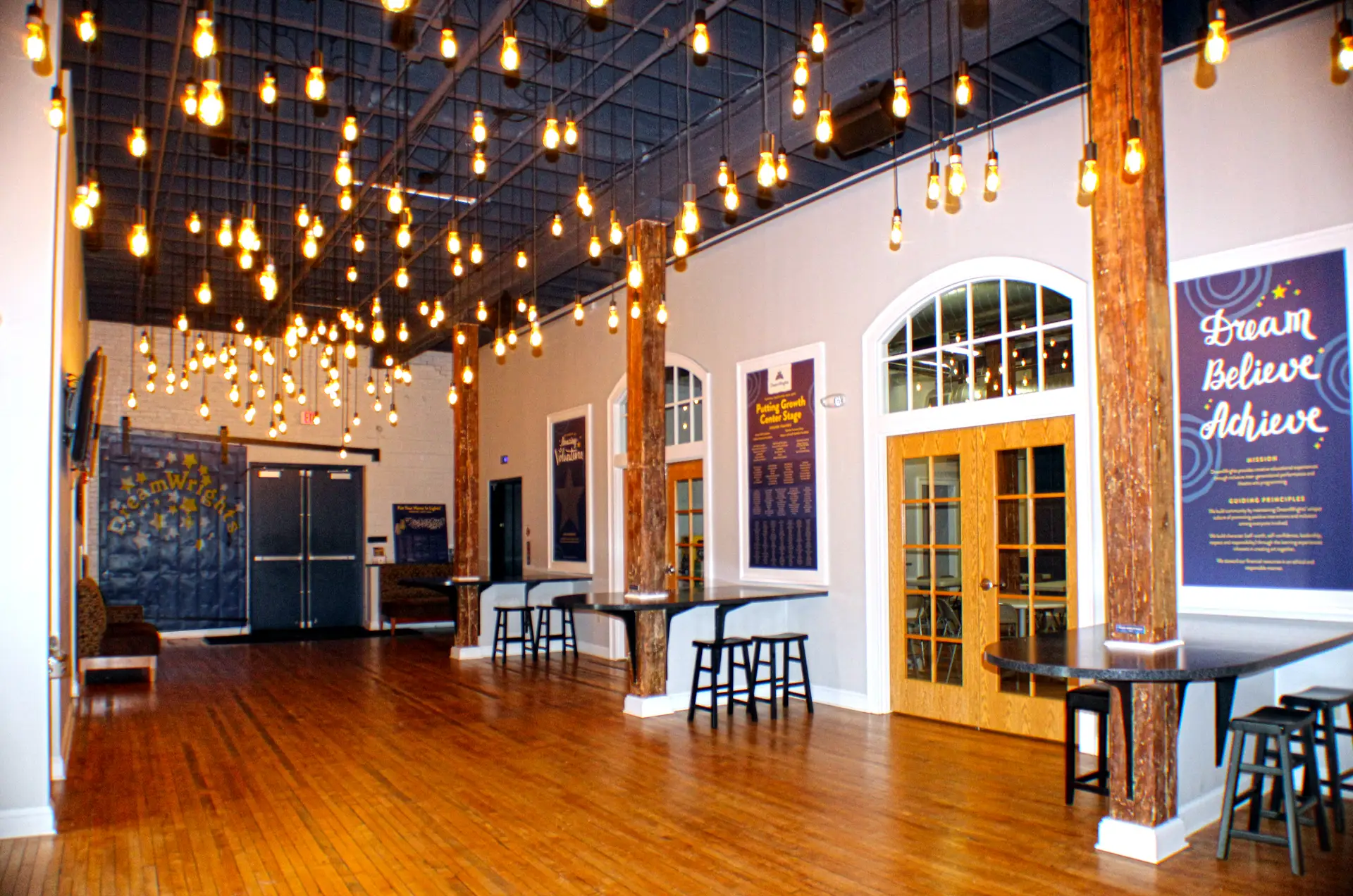 Although their black box theater accommodated large events, DreamWrights sought the flexibility to have multiple smaller event spaces that enabled unobtrusive set-builds and accommodation for multiple shows. Additionally, enhancements to the programming of the entrance area were critical to enable a better guest experience. Phase I addressed the theater’s first floor, including a remodeled lobby, new box office, ADA compliant restrooms and ADA accessible elevator and concession area. A new black box studio space, offering a more intimate setting than the main stage area, seats 75 to 100 people. Warehaus also led the design direction for many interior elements, including the lobby pendant lights.